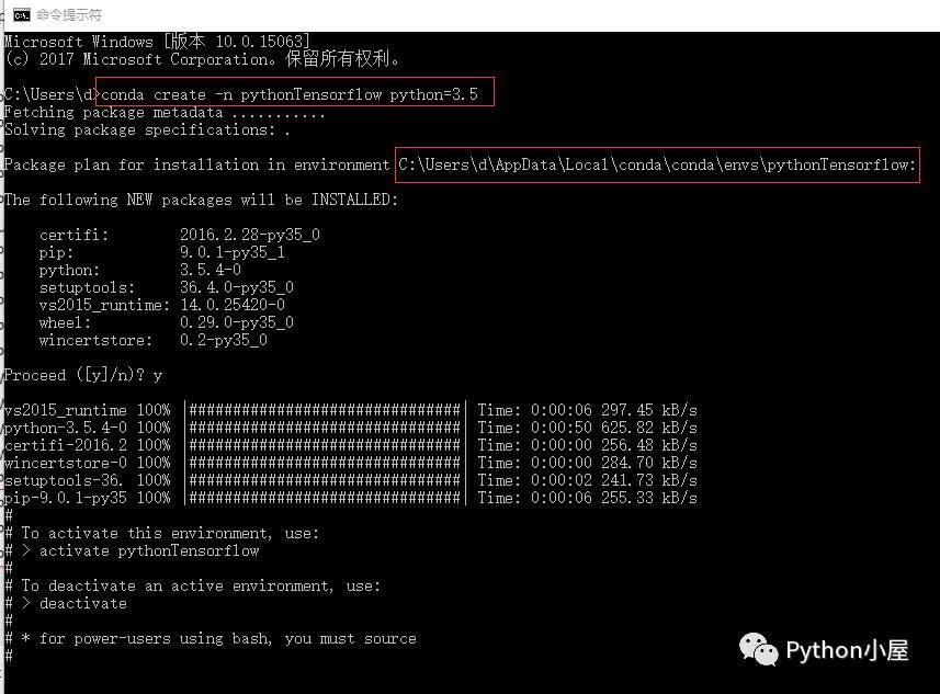 接下来,进入命令提示符cmd环境,执行命令conda create -n pythonTensorflow python=3.5创建一个基于Python 3.5的虚拟开发环境,如下图