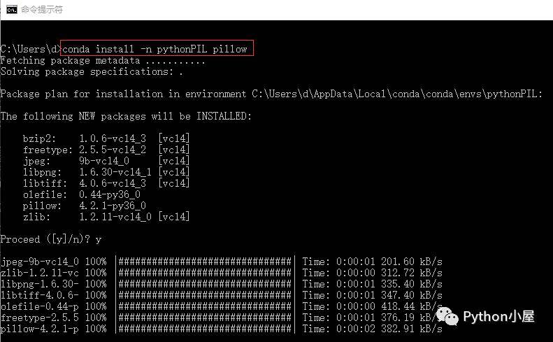 接下来使用命令conda install -n pythonPIL pillow为名字为pythonPIL的虚拟开发环境安装扩展库pillow,如下图