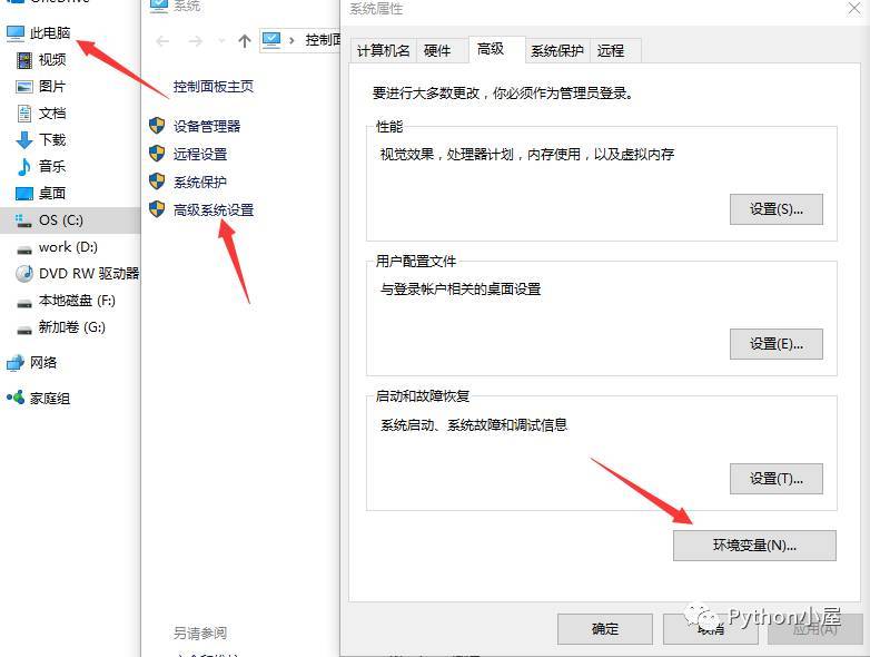 为了能够正常使用Anaconda3创建虚拟开发环境,首先最好保证在安装Anaconda3时已经勾选“添加环境变量”,如果没有的话,安装完成Anaconda3之后可以手动添加和配置环境变量。本文以Win10 64位为例,首先打开资源管理器,右键单击“此电脑”,在弹出的菜单中单击“属性”,在弹出的窗口中单击“高级系统设置”,如下图