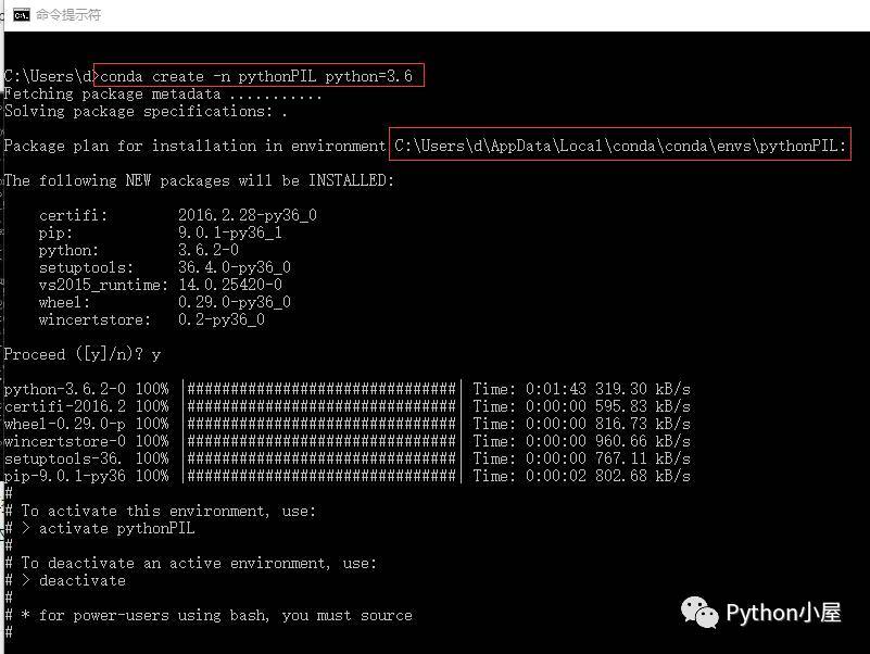 然后再执行命令conda create -n pythonPIL python=3.6创建一个基于Python 3.6版本的虚拟开发环境,如下图