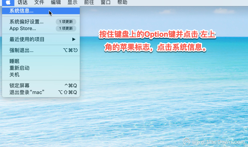 1、按住键盘上的Option键并点击 左上角的苹果标志,点击系统信息。
