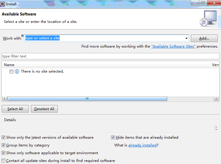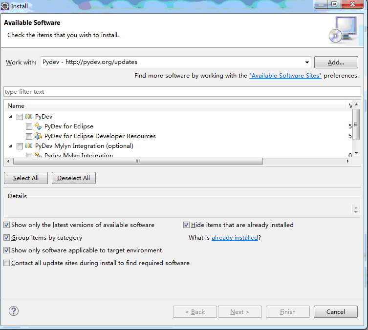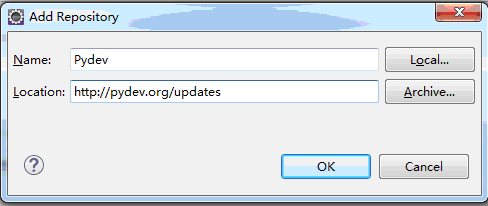 启动eclipse后,点击eclipse菜单Help->Install New Software...,在弹出的对话框中,点击Add按钮, Name中填:Pydev, Location中填http://pydev.org/updates