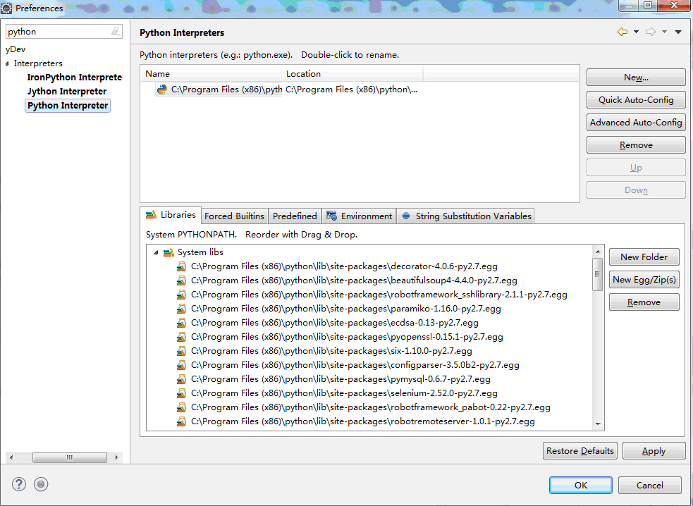 安装完成后,需要在eclipse中配置Python解释器,在Eclipse菜单栏中,点击Windows ->Preferences. 在对话框中,点击pyDev->Interpreter - Python. Interpreters 点击New按钮, 选择python.exe的路径, 打开后显示出一个包含很多复选框的窗口. 点OK