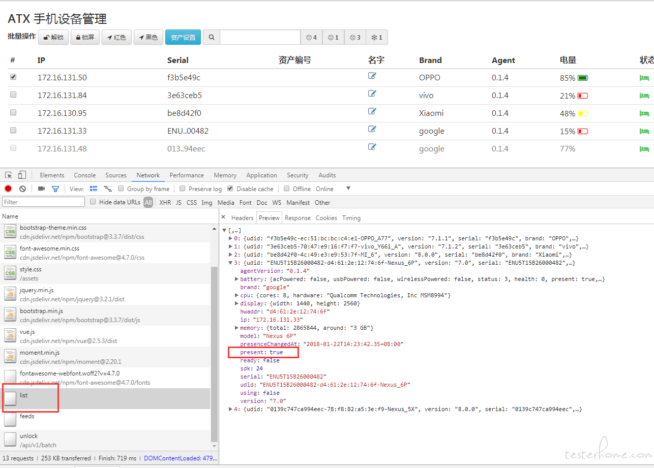 1.在 ATX server自带的设备管理页面中,列出了当前可用的设备列表。于是尝试从这个页面的网络请求中获取设备列表,果然有收获:
