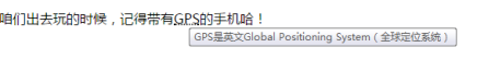 | <p>咱们出去玩的时候,记得带有<abbr title="GPS是英文Global Positioning System(全球定位系统)">GPS</abbr>的手机哈!</p> |