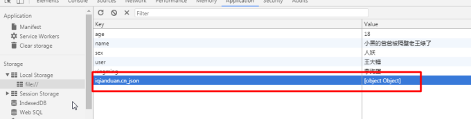| localStorage.setItem('iqianduan.cn_json',{"a":100,"b":200}) |