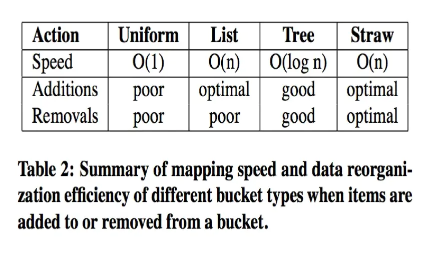 - straw buckets:允许所有项通过类似抽签的方式来与其他项公平“竞争”。定位副本时,bucket中的每一项都对应一个随机长度的straw,且拥有最长长度的straw会获得胜利(被选中),添加或者重新计算,子树之间的数据移动提供最优的解决方案。