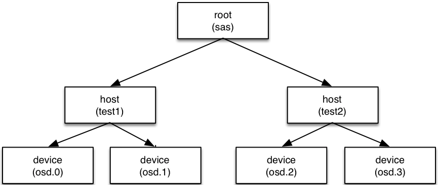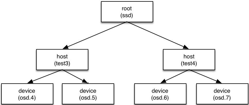 叶子节点是device(也就是osd),其他的节点称为bucket节点,这些bucket都是虚构的节点,可以根据物理结构进行抽象,当然树形结构只有一个最终的根节点称之为root节点,中间虚拟的bucket节点可以是数据中心抽象、机房抽象、机架抽象、主机抽象等。
