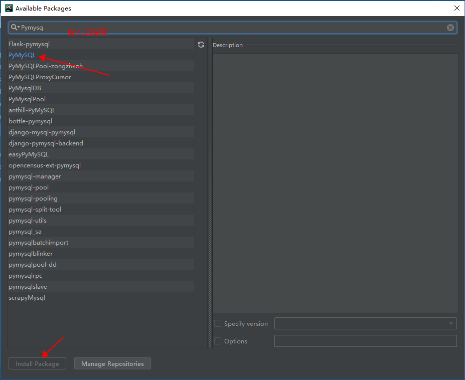 输入Pymysql搜索,选中PyMySql,然后点击install package