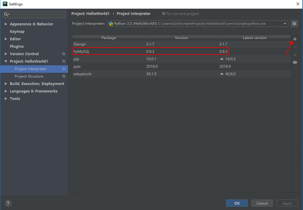 在Pycharm中 File → Settings→→Project Interpreter,图中是已经添加好了的,如果还没添加的话,点击右侧的+号