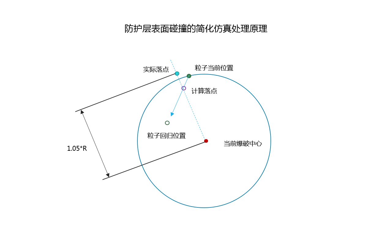 上面的位置更新策略的难点在于2.1中的计算方法,也就是粒子回归途中碰到防护层表面时的处理。为了避开复杂的向量计算,示例代码中对碰撞的处理是直接改变其下一个落点的位置,而不是通过速度和受力来计算其位置,具体的做法是从当前爆炸中心向下一次落点位置连线生成向量,然后强制将当前粒子置于1.05倍半径的地方,如下图所示: