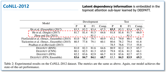 该模型在CoNLL-2005和CoNll-2012的SRL数据集上都取得了先进结果。我们知道序列标注问题中,标签之间是有依赖关系的,比如标签I,应该是出现在标签B之后,而不应该出现在O之后。目前主流的序列标注模型是BiLSTM-CRF模型,利用CRF进行全局标签优化。在对比实验中,He et al和Zhou and Xu的模型分别使用了CRF和constrained decoding来处理这个问题。可以看到本论文仅使用self-attention,作者认为在模型的顶层的attention层能够学习到标签潜在的依赖信息。