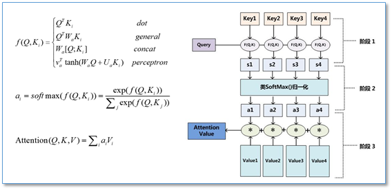 在计算attention时主要分为三步,第一步是将query和每个key进行相似度计算得到权重,常用的相似度函数有点积,拼接,感知机等;然后第二步一般是使用一个softmax函数对这些权重进行归一化;最后将权重和相应的键值value进行加权求和得到最后的attention。目前在NLP研究中,key和value常常都是同一个,即key=value。
