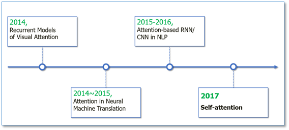 Attention机制最早是在视觉图像领域提出来的,应该是在九几年思想就提出来了,但是真正火起来应该算是2014年google mind团队的这篇论文《Recurrent Models of Visual Attention》,他们在RNN模型上使用了attention机制来进行图像分类。随后,Bahdanau等人在论文《Neural Machine Translation by Jointly Learning to Align and Translate》中,使用类似attention的机制在机器翻译任务上将翻译和对齐同时进行,他们的工作算是第一个将attention机制应用到NLP领域中。接着attention机制被广泛应用在基于RNN/CNN等神经网络模型的各种NLP任务中。2017年,google机器翻译团队发表的《Attention is all you need》中大量使用了自注意力(self-attention)机制来学习文本表示。自注意力机制也成为了大家近期的研究热点,并在各种NLP任务上进行探索。下图维attention研究进展的大概趋势。