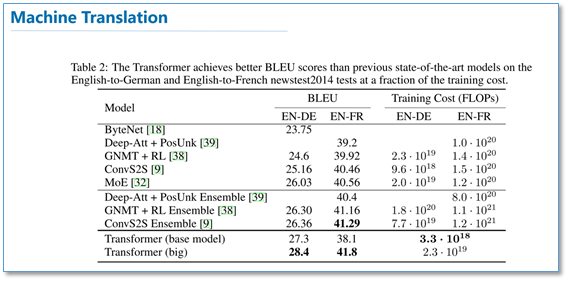 最后我们看一下实验结果,在WMT2014的英德和英法机器翻译任务上,都取得了先进的结果,且训练速度优于其他模型。