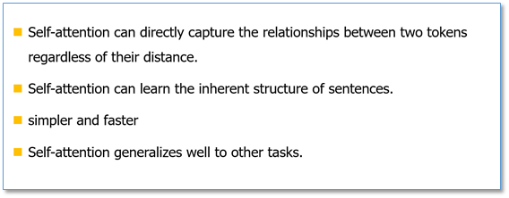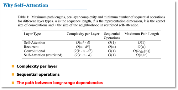 对于使用自注意力机制的原因,论文中提到主要从三个方面考虑(每一层的复杂度,是否可以并行,长距离依赖学习),并给出了和RNN,CNN计算复杂度的比较。可以看到,如果输入序列n小于表示维度d的话,每一层的时间复杂度self-attention是比较有优势的。当n比较大时,作者也给出了一种解决方案self-attention(restricted)即每个词不是和所有词计算attention,而是只与限制的r个词去计算attention。在并行方面,多头attention和CNN一样不依赖于前一时刻的计算,可以很好的并行,优于RNN。在长距离依赖上,由于self-attention是每个词和所有词都要计算attention,所以不管他们中间有多长距离,最大的路径长度也都只是1。可以捕获长距离依赖关系。