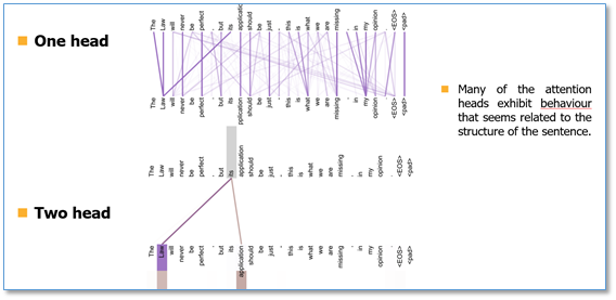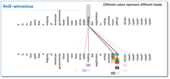 最后我们看一下attention可视化的效果(这里不同颜色代表attention不同头的结果,颜色越深attention值越大)。可以看到self-attention在这里可以学习到句子内部长距离依赖"making…….more difficult"这个短语。在两个头和单头的比较中,可以看到单头"its"这个词只能学习到"law"的依赖关系,而两个头"its"不仅学习到了"law"还学习到了"application"依赖关系。多头能够从不同的表示子空间里学习相关信息。