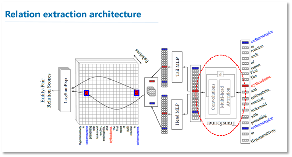 这篇论文是Andrew McCallum团队应用self-attention在生物医学关系抽取任务上的一个工作,应该是已经被NAACL2018接收。这篇论文作者提出了一个文档级别的生物关系抽取模型,里面做了不少工作,感兴趣的读者可以更深入阅读原文。我们这里只简单提一下他们self-attention的应用部分。论文模型的整体结构如下图,他们也是使用google提出包含self-attention的transformer来对输入文本进行表示学习,和原始的transformer略有不同在于他们使用了窗口大小为5的CNN代替了原始FNN。