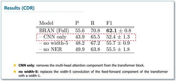 我们关注一下attention这部分的实验结果。他们在生物医学药物致病数据集上(Chemical Disease Relations,CDR)取得了先进结果。去掉self-attention这层以后可以看到结果大幅度下降,而且使用窗口大小为5的CNN比原始的FNN在这个数据集上有更突出的表现。