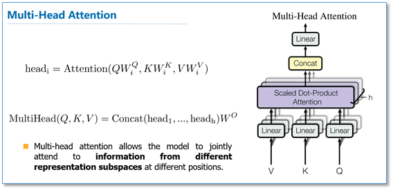 多头attention(Multi-head attention)结构如下图,Query,Key,Value首先进过一个线性变换,然后输入到放缩点积attention,注意这里要做h次,其实也就是所谓的多头,每一次算一个头。而且每次Q,K,V进行线性变换的参数W是不一样的。然后将h次的放缩点积attention结果进行拼接,再进行一次线性变换得到的值作为多头attention的结果。可以看到,google提出来的多头attention的不同之处在于进行了h次计算而不仅仅算一次,论文中说到这样的好处是可以允许模型在不同的表示子空间里学习到相关的信息,后面还会根据attention可视化来验证。