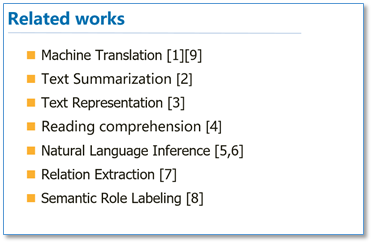 [5] Shen, T.; Zhou, T.; Long, G.; Jiang, J.; Pan, S.; and Zhang, C. Disan: Directional self-attention network for rnn/cnn-free language understanding. arXiv preprint arXiv:1709.04696, 2017.