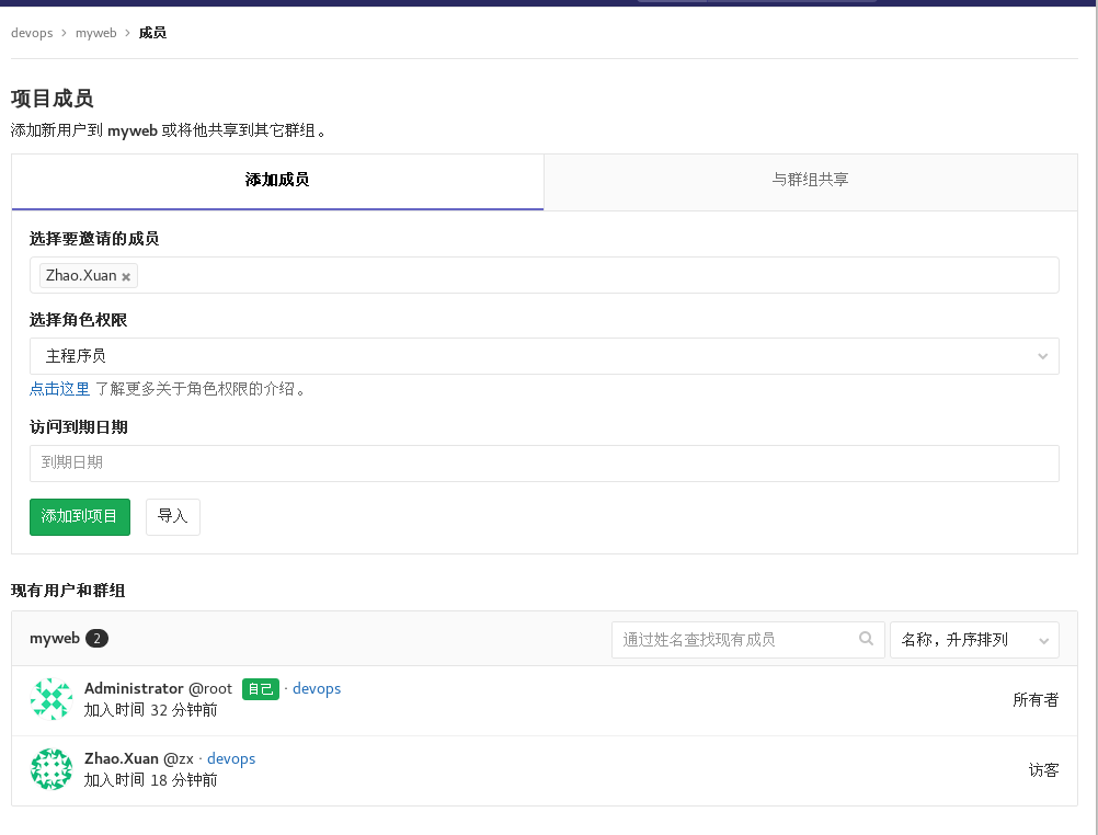 2.用户,成员member:对应用户账户,可以将用户加入到组或者项目