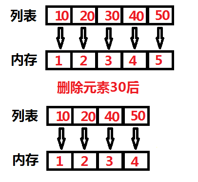由上图我们知道元素30对应的内存地址是3,删除元素30后,为保证列表的线性,元素40和元素50内存地址都向前移了一位,元素40的内存地址由原来的4变成3,元素50的内存地址由原来的5变成4。如果把列表的第一个元素删除了,后面的整个列表都会依次向前补齐位置。而双端队列不会,无论是删除队列的头还是尾队列的整体不会进行补位的操作。