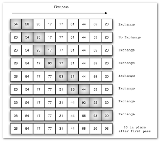 - 持续每次对越来越少的元素重复上面的步骤,直到没有任何一对数字需要比较。