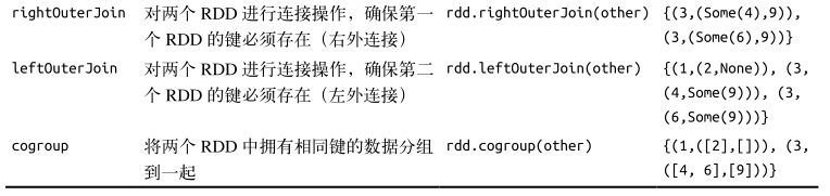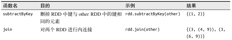 针对两个pair RDD的转化操作(rdd = {(1, 2), (3, 4), (3, 6)} other = {(3, 9)} )