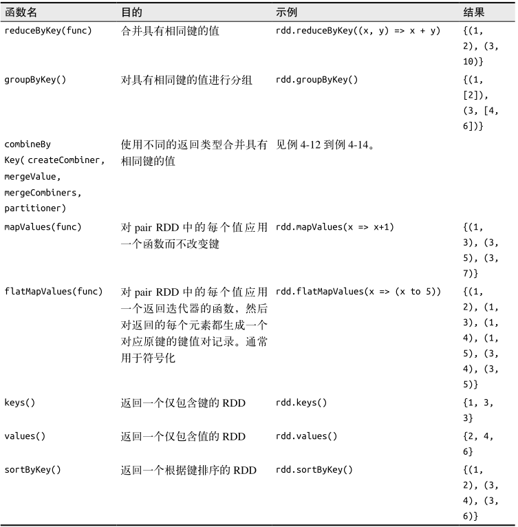 当数据集以键值对形式组织的时候,聚合具有相同键的元素进行一些统计是很常见的操作。之前讲解过基础 RDD 上的 fold() 、 combine() 、 reduce() 等行动操作,pair RDD 上则有相应的针对键的转化操作。Spark 有一组类似的操作,可以组合具有相同键的值。这些操作返回 RDD,因此它们是转化操作而不是行动操作。
