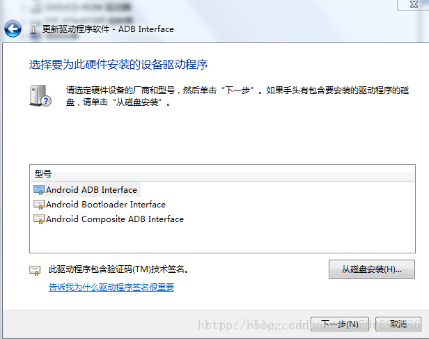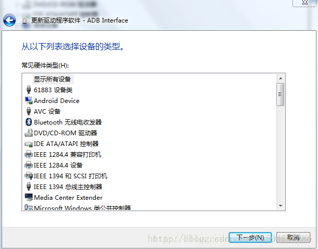 第五步: 在这一步,在型号选择“Android ADB Interface”,点击“下一步”,如下图。