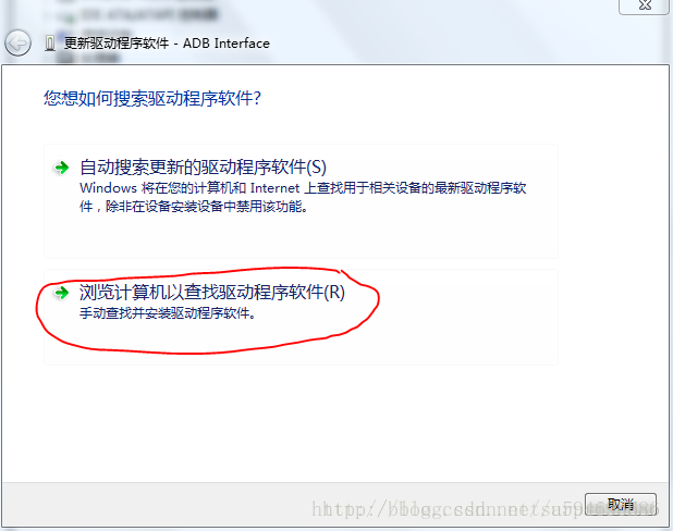 邮件单机设备管理器中带感叹号的”ADB Interface”,点击右键的菜单的”更新驱动软件程序软件”,弹出”更新驱动程序软件”对话框,如下图所示: