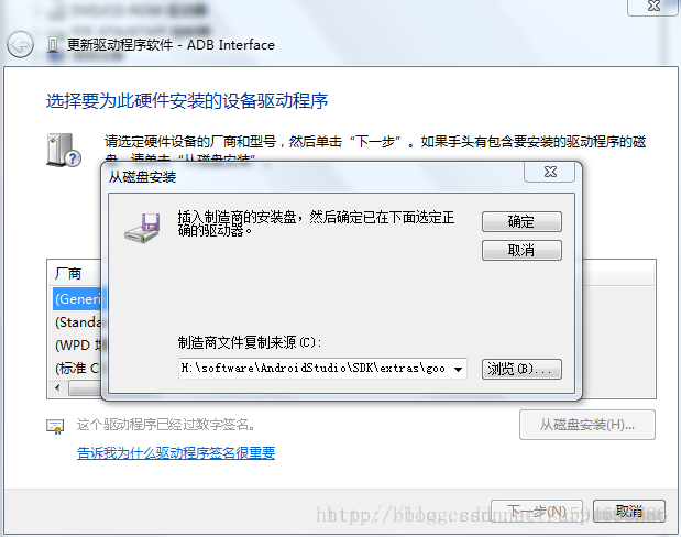 弹出”从磁盘安装对话框”,在”制造商文件复制来源”路径,选择SDK下的”extras/google/usb_driver/android_winusb.inf”,点击”确定”,如下图: