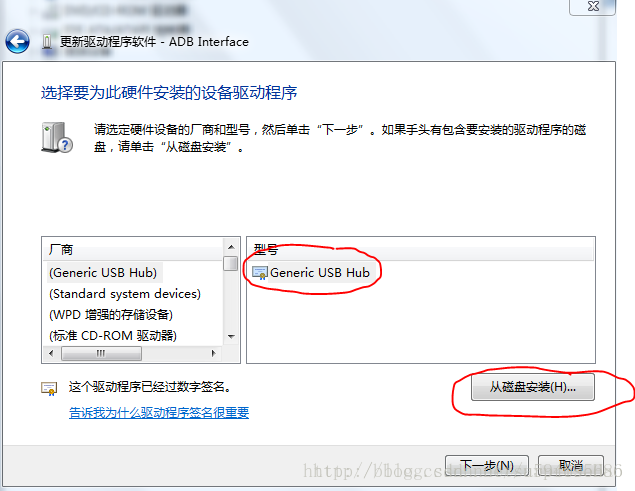 第四步: 在这一步选择”Generic USB Hub” ,并单击”从磁盘安装”,如下图: