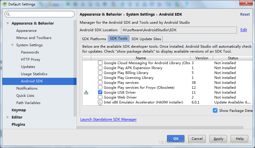 第一步: 首先,通过AndroidStduio的”settings”–“Android SDK”–“SDK Tools” 对话框如下