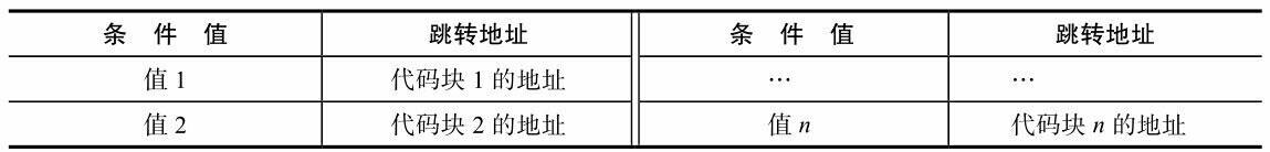 switch的实现也是同上述代码原理相同,转换成跳转指令。但是switch的转换和具体系统实现有关。如果分支比较少,可能会转换为跳转指令。如果分支比较多,使用条件跳转会进行很多次的比较运算,效率比较低,可能会使用一种更为<u>高效的方式</u>,叫跳转表。跳转表是一个映射表,存储了可能的值以及要跳转到的地址,下表所示: