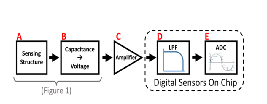 通常包含在MEMS加速度计信号调节路径中的两个关键硬件组件分别是图中的放大器和低通滤波器(LPF),组件C和D。在理想的情况下,当放大器和LPF工作正常时,任何注入的声加速度信号在数字化之前都会被信号调理硬件去除,并且不会传递到终端系统。 但是,实际上这些组件具有物理限制。具体而言,每个加速度计都可以测量的加速度的最大幅度和频率有一个限制。超过这些限制会影响它们的加速度测量。
