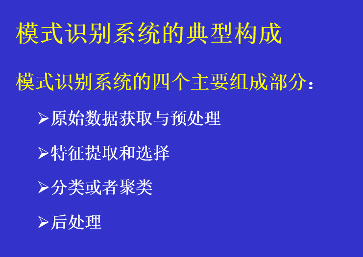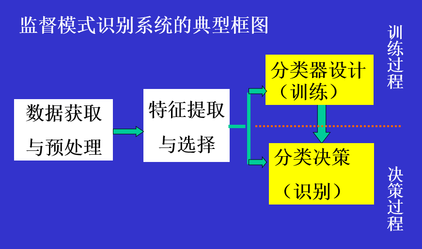 ###模式识别导论 概念: 模式识别(英语:Pattern Recognition),就是通过计算机用数学技术方法来研究模式的自动处理和判读。我们把环境与客体统称为“模式”。随着计算机技术的发展,人类有可能研究复杂的信息处理过程。信息处理过程的一个重要形式是生命体对环境及客体的识别。对人类来说,特别重要的是对光学信息(通过视觉器官来获得)和声学信息(通过听觉器官来获得)的识别。这是模式识别的两个重要方面。市场上可见到的代表性产品有光学字符识别、语音识别系统。