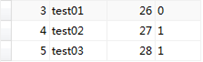 VALUES (3, 'test01', 26, 0), (4, 'test02', 27, 1), (5, 'test03', 28, 1);