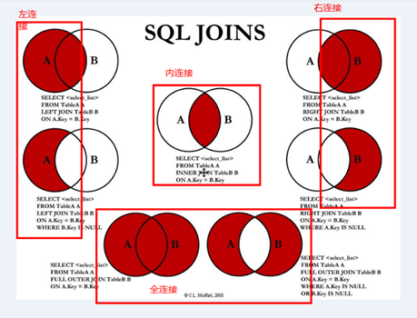 连接查询总的分类可以用一张图来简单描述,主要分为外连接查询(左外连接、右外连接、全连接)、内连接查询(内连接、自连接)。