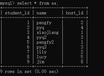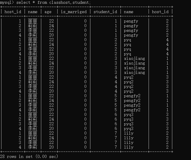 如果想只返回丽丽老师班上的同学,就在后面加一个and host_id=1就好了。大家可以试一下如果老师不存在返回的是什么结果。