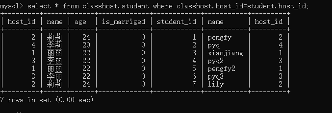 内连接就是利用条件从笛卡尔积结果中筛选出了正确的结果。我们前面学过的where就可以用在这,真正对我们有意义的结果就是两张表host_id相同的时候那条数据: