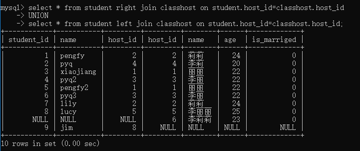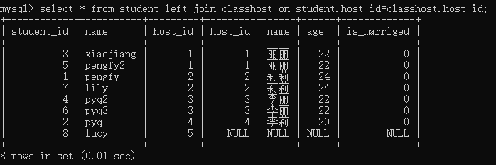 select * from student left join classhost on student.host_id=classhost.host_id;