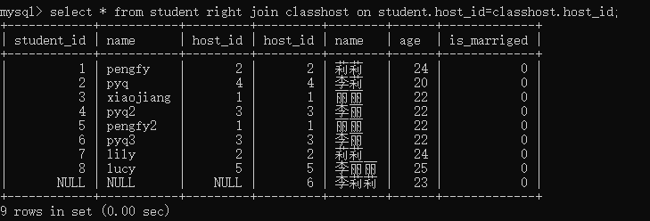 select * from student right join classhost on student.host_id=classhost.host_id;