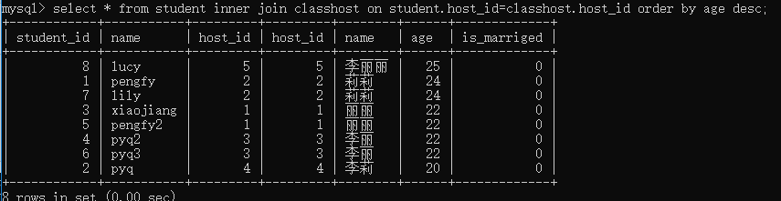 select * from student inner join classhost on student.host_id=classhost.host_id order by age desc;