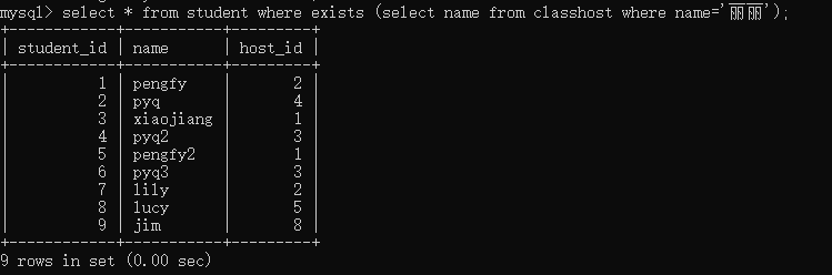 EXISTS关字键字表示存在。在使用EXISTS关键字时,内层查询语句不返回查询的记录,而是返回一个真假值Ture或False。当返回Ture时,外层查询语句将进行查询;当返回值为False时,外层查询语句不进行查询。那我们就以丽丽老师是否存在作为判断依据,如果存在我就返回所有学生表: