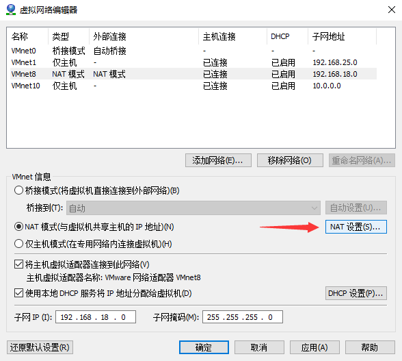 选择 NET模式(VMnet8),点击 NAT设置