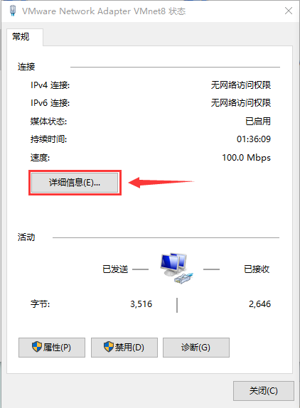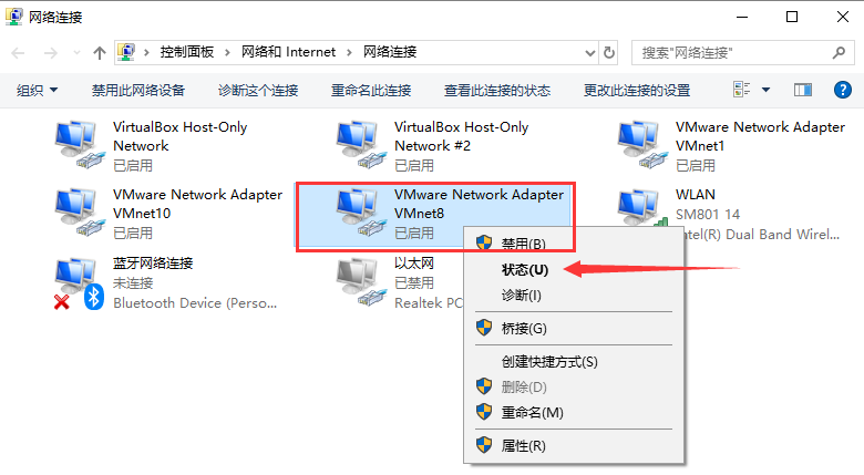 进入系统的网络连接面板,找到VMware Network Adapter VMnet8,右击选择状态