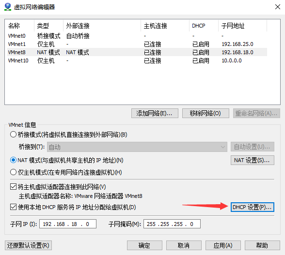 选择 NET模式(VMnet8),点击 DHCP 设置