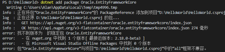 所以再执行:dotnet add package Oracle.EntityFrameworkCore -v 2.18.0-beta3